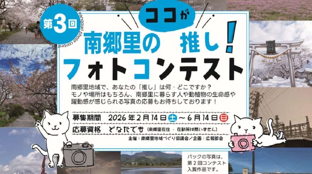 「第3回 ココが南郷里の推し!フォトコンテスト」 南郷里地域づくり協議会主催・広報部会企画 画像をクリックすると拡大します。 申込期間 2026年2月14日(土)~6月14日(日) 応募資格 どなたでも(南郷里在住・在勤等は問いません) 応募条件 ・南郷里地域... HP team
