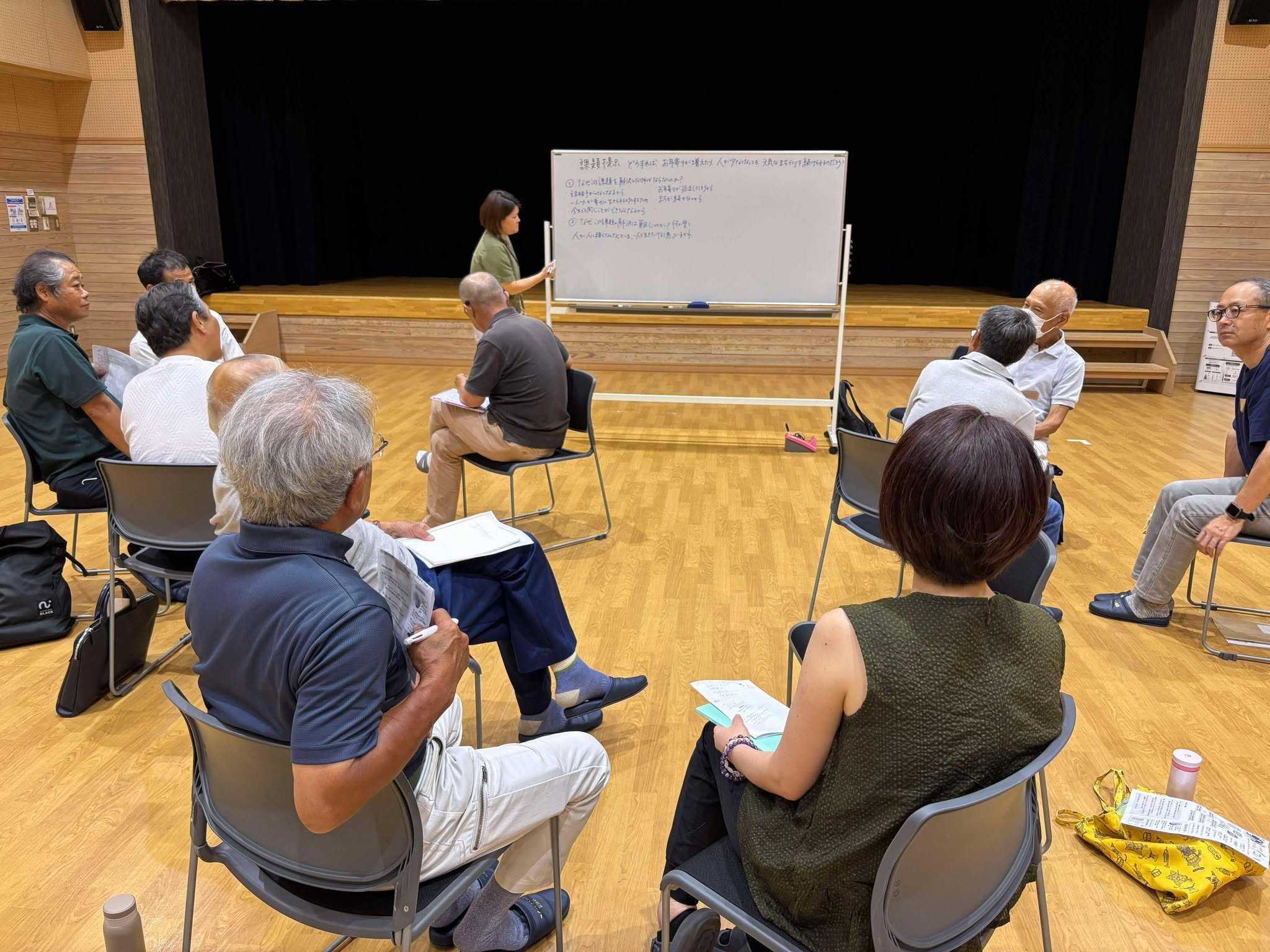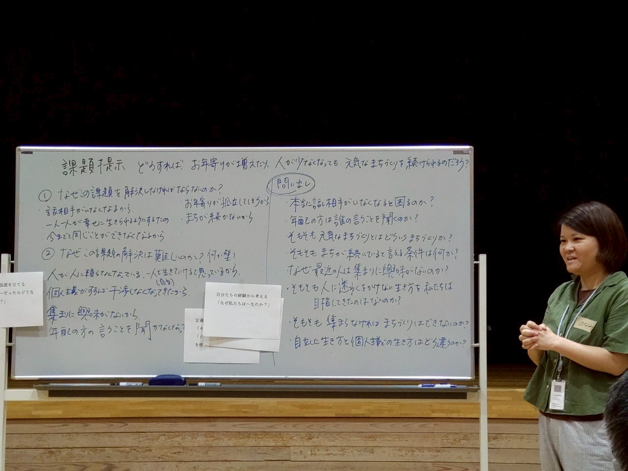 4名グループでの質問し合うアイスブレイクの後、事前にAIを活用して作成したまちづくりの課題に関する複数の問いの中から、「お年寄りが増えたり、人が少なくなっても、元気なまちづくりをどうしたら続けられるだろう?」を参加者全員で選出いたしました。